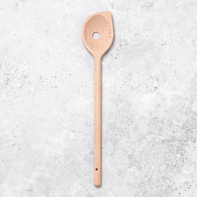 A wooden spoon with pointed edge, designed to get into the corners of your pot when stirring. It also has a small central hole for cooking liquids to partially pass through making it easier to stir thick sauces and soups.
