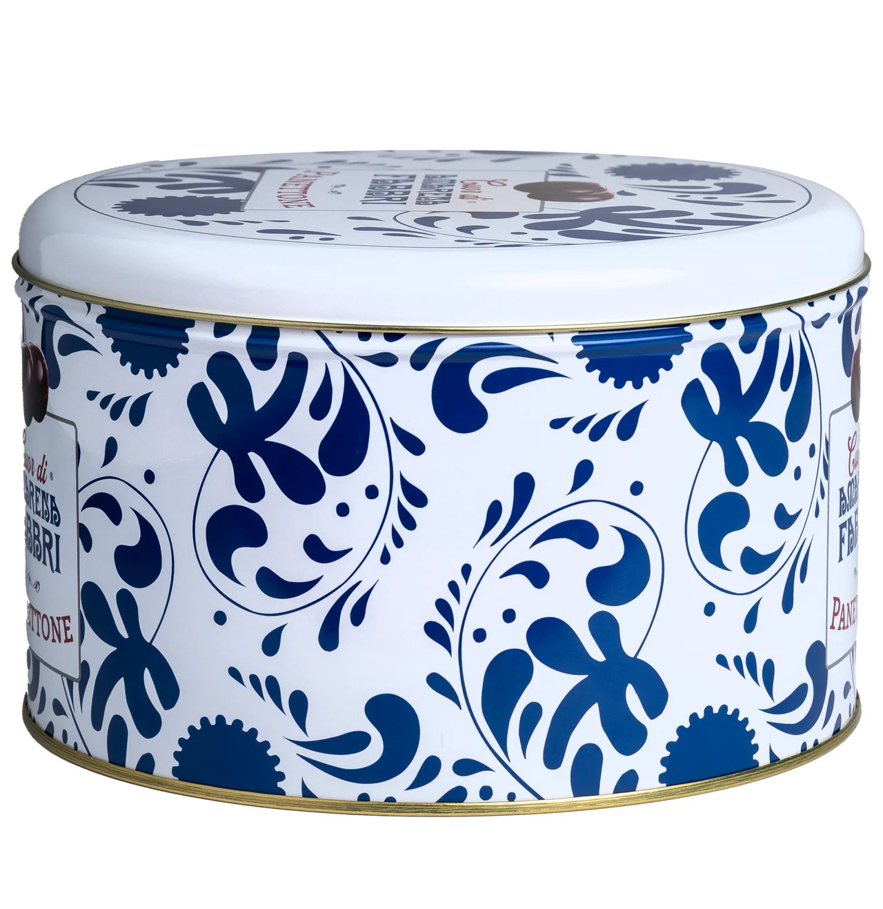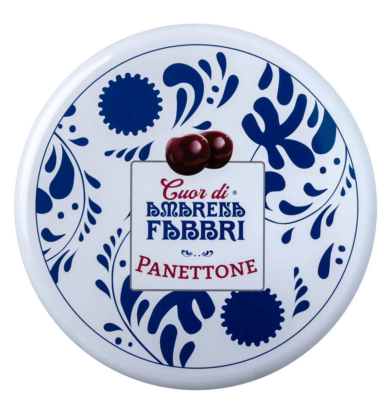 A naturally leavened panettone studded with candied black cherries, presented in a circular tin featuring Fabbri 1905's iconic blue and white Faenza motif.