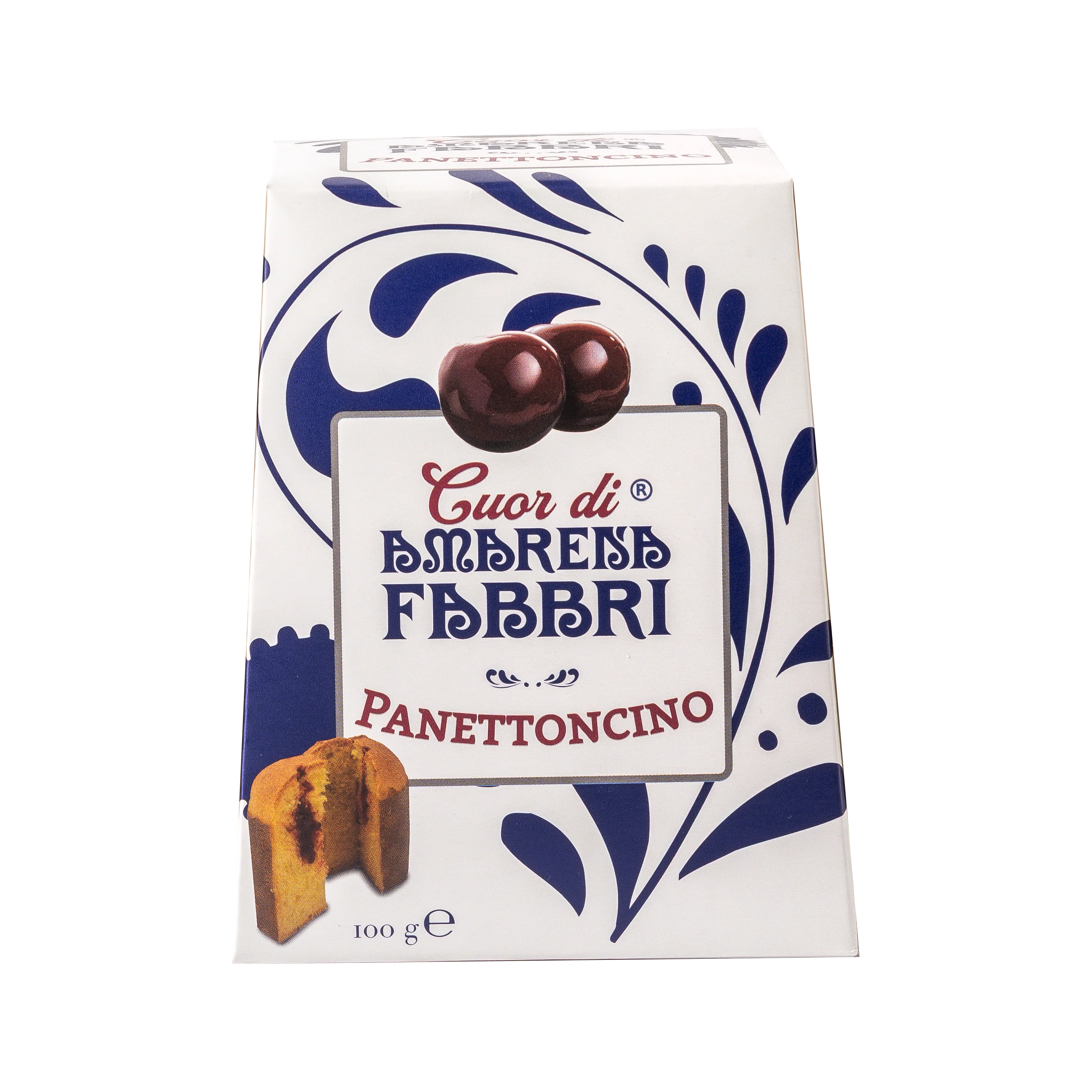 A naturally leavened mini panettone with a black cherry filling, presented in a small box featuring Fabbri 1905's iconic blue and white Faenza motif.