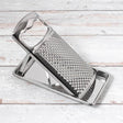 Lift up the handle on the grater to reveal a metal arm that swings out to support and stand up the grater. The grater sits at a 45° angle to aid grating, holding the handle keeps it steady. Cheese is caught in the tray below.