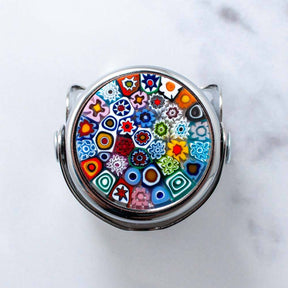 These chromed metal champagne stoppers have a delicate decorative circle of glass attached to the top. Decorative Glass rods called 'murrine' are cut into small discs (millefiori beads) and arranged on a copper frame into a mosaic pattern before being heated and fused together in the oven overnight. The end result is captivating and beautiful.