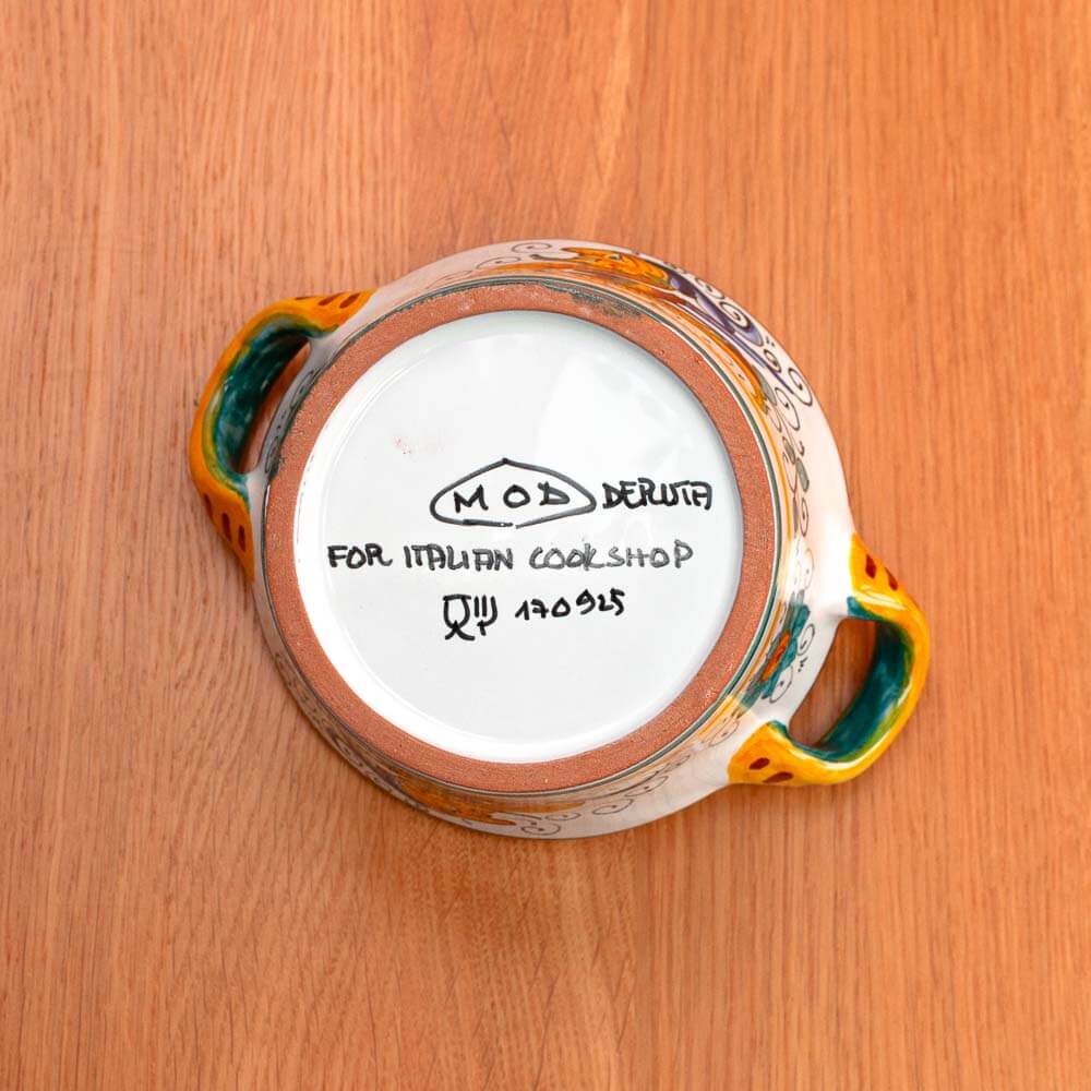 Made in Deruta using Italian clay, it is carefully prepared and shaped by hand using a potter's wheel or mould to form the item. The raw clay item is left to air-dry for 20 days before being fired at over 1000°C and left to cool in the kiln for over 24 hours to produce the porous 'biscuitware'.