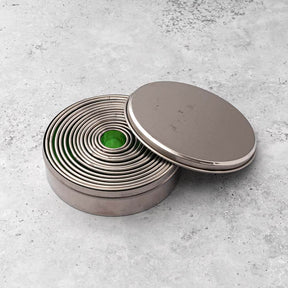 The cutters are shaped as smooth circles. The cutters come nested inside a tin for easy storage and protection.