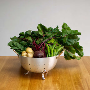 A large aluminium colander, created in a classical, vintage style, sits on three curved feet. Two aged, brass handles adorn the sides to complete the look.
