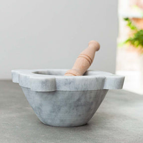 An exquisite, white carrara marble mortar with beechwood pestle.