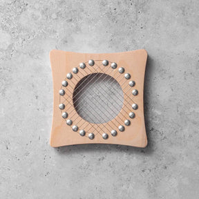 The puntarelle cutter is made from layers of birch plywood and thin, stainless steel wires formed into a criss-cross pattern.
